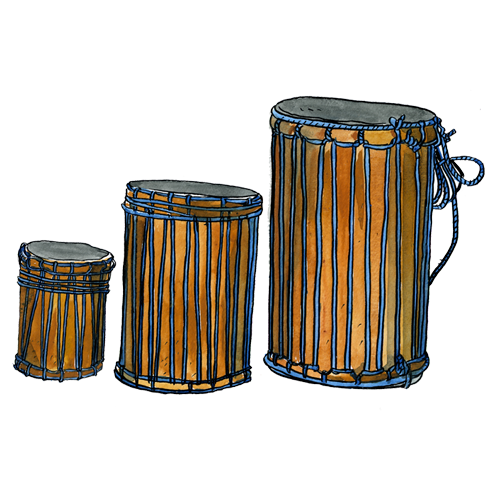 Une tige de bois est fixée au centre de ce tambour à une mmbrane. La friction de la tige avec un linge humide ou les doigts mouillés du musicien produit un son. On modifie la hauteur du son par une pression sur la membrane avec l’autre main. Instrument d’origine africaine.