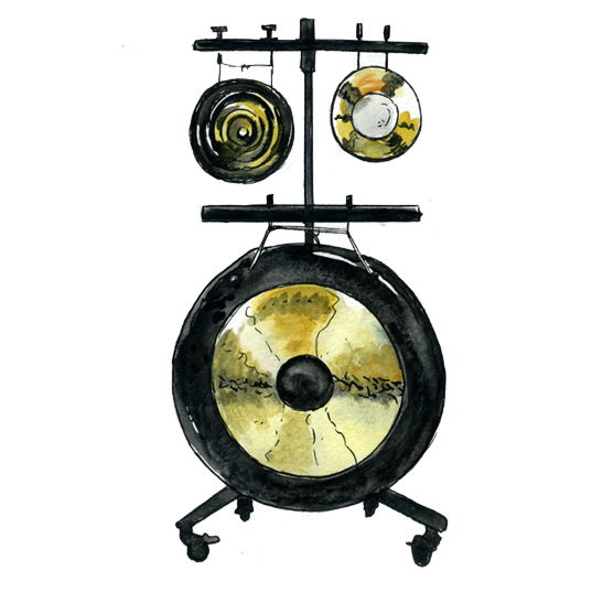 Gongs à bulbes, tam-tams (gongs plats), cloches plates, cymbales chinoise et cloches.